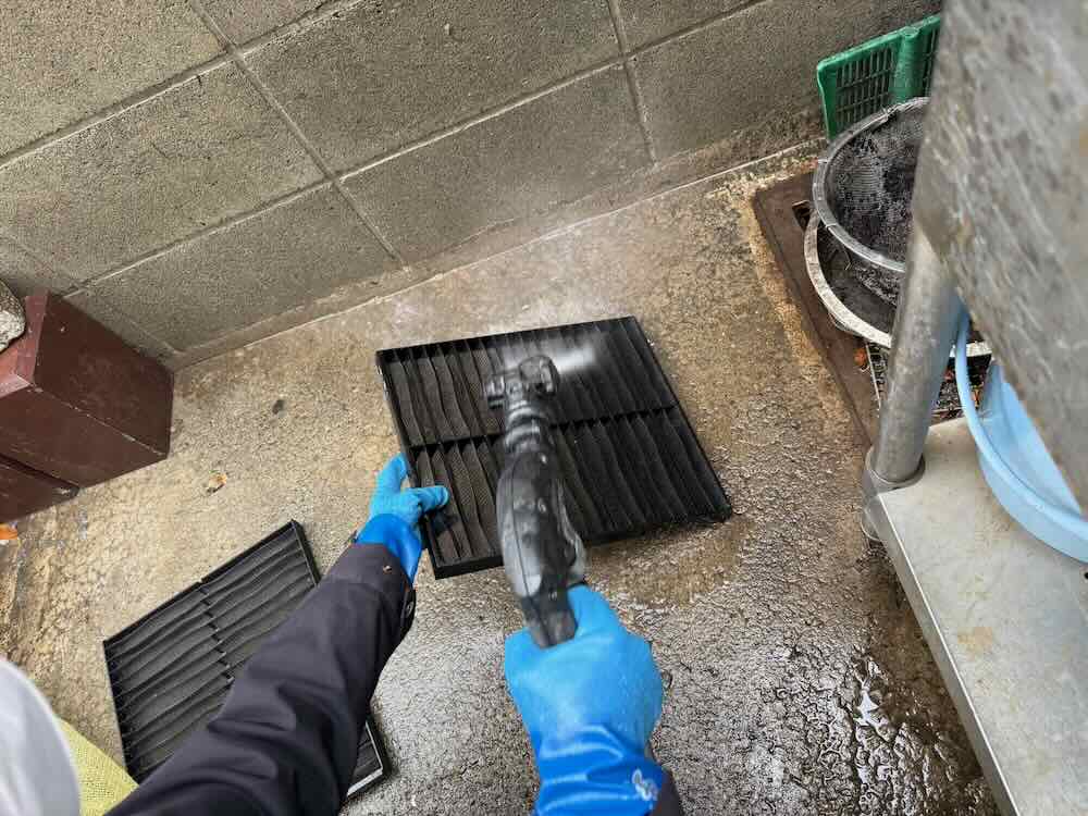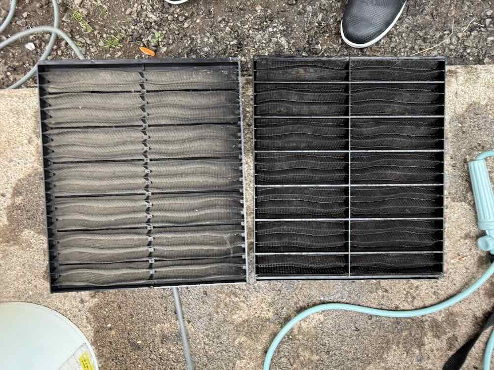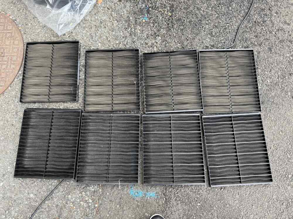 在庫のないフィルターに関しては現地清掃作業となります。こちらは全熱交換機のフィルターです。1台で4枚組のフィルターとなります。